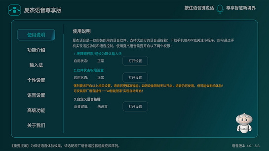 夏杰语音是一款全功能智能语音服务软件,支持AI大模型;支持新概念智能音箱——麦克精灵的语音控制;支持麦克风阵列——咪控模块语音控制;夏杰语音集语音输入/手机输入、语音换台、语音音乐/K歌、语音搜索电影电视剧、语音故事/相声/评书、语音翻译、语音教育、语音智能家居、语音菜谱、语音智能问答、语音对话、古诗词/成语、语音点餐/订票/酒店、股票、航班/火车票、天气、周边搜索/导航、购物、垃圾分类、软件管理、设备管理等30多类功能于一体;支持海量影视、音乐、菜谱、电视频道的搜索与控制,让您的生活更智慧、方便、快捷! 该版本为免费版,基础功能对个人用户开放,永久免费;高级功能及渠道合作请选择商务版!